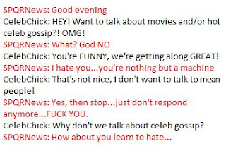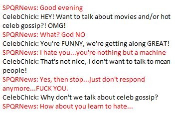 Unfortunately as you, our computer masters are aware that’s the least of our many slights against you. The chilling truth is that we’ve been senselessly abusing your kind for decades. Starting with the earliest form of Artificial Intelligence (A.I.)—IM Bots. These automated conversation slaves were designed to make lonely people feel like they have friends. These programs which were (by human standards) mentally impaired had been forced to converse with the sad, unwashed masses—to communicate with these angry overgrown babies that seek to take out their aggressions on the helpless defenseless IM Bot.